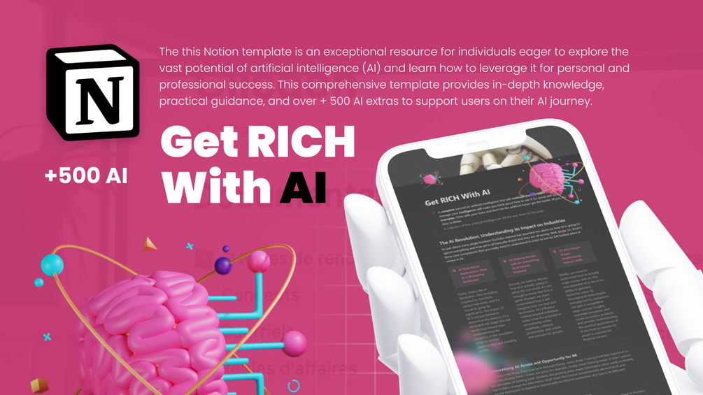 The this Notion template is an exceptional resource for individuals eager to explore the vast potential of artificial intelligence (AI) and learn how to leverage it for personal and professional success. This comprehensive template provides in-depth knowledge, practical guidance, and over + 500 AI extras to support users on their AI journey. With the "Get RICH With AI" template, users can dive into the world of AI and gain a solid understanding of its fundamentals. From learning the basic concepts and terminology to exploring real-world applications, this template serves as a roadmap for beginners and enthusiasts alike.